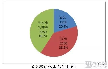 2018年,国家药品监督管理局共批准医疗器械首次注册、延续注册和变更注册5528项。与2017年相比注册批准总数量减少38.0%。其中,首次注册 1128项,延续注册2150项,许可事项变更2250项。