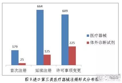 从注册形式看,首次注册204项,占全部进口第三类医疗器械注册数量的11.2%;延续注册789项,占全部进口第三类医疗器械注册数量的43.2%;许可事项变更注册834项,占全部进口第三类医疗器械注册数量的45.6%。注册形式分布情况见图9。