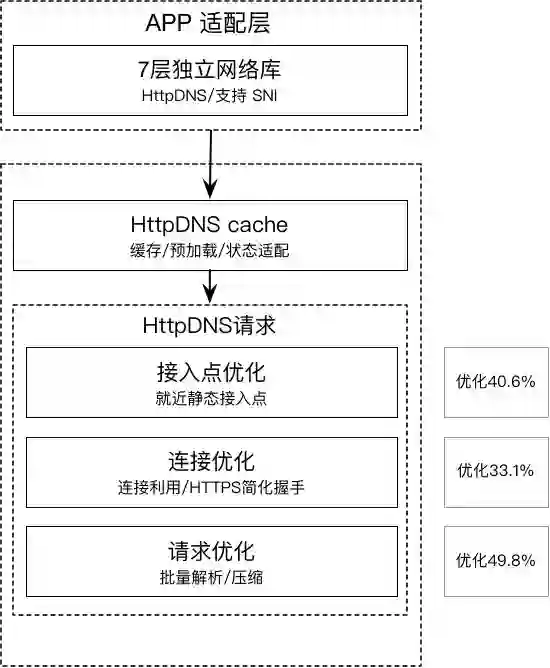 其次,综合考虑HTTPDNS请求的时延特性,在端上提供适当的cache预加载/更新策略,提升HTTPDNS覆盖率。