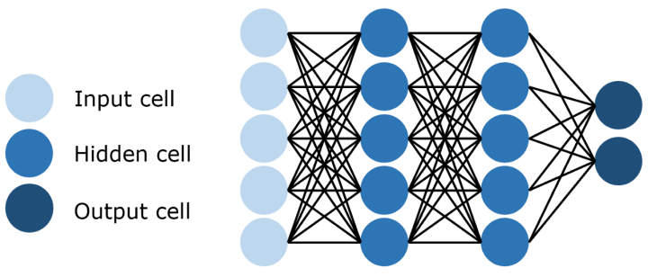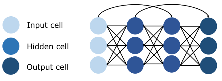 前馈网络是感知器的集合,其中有三种基本类型的层: 输入层、隐藏层和输出层。在每个连接过程中,来自前一层的信号被乘以一个权重,增加一个偏置,然后通过一个激活函数。前馈网络使用反向传播迭代更新参数,直到达到理想的性能。