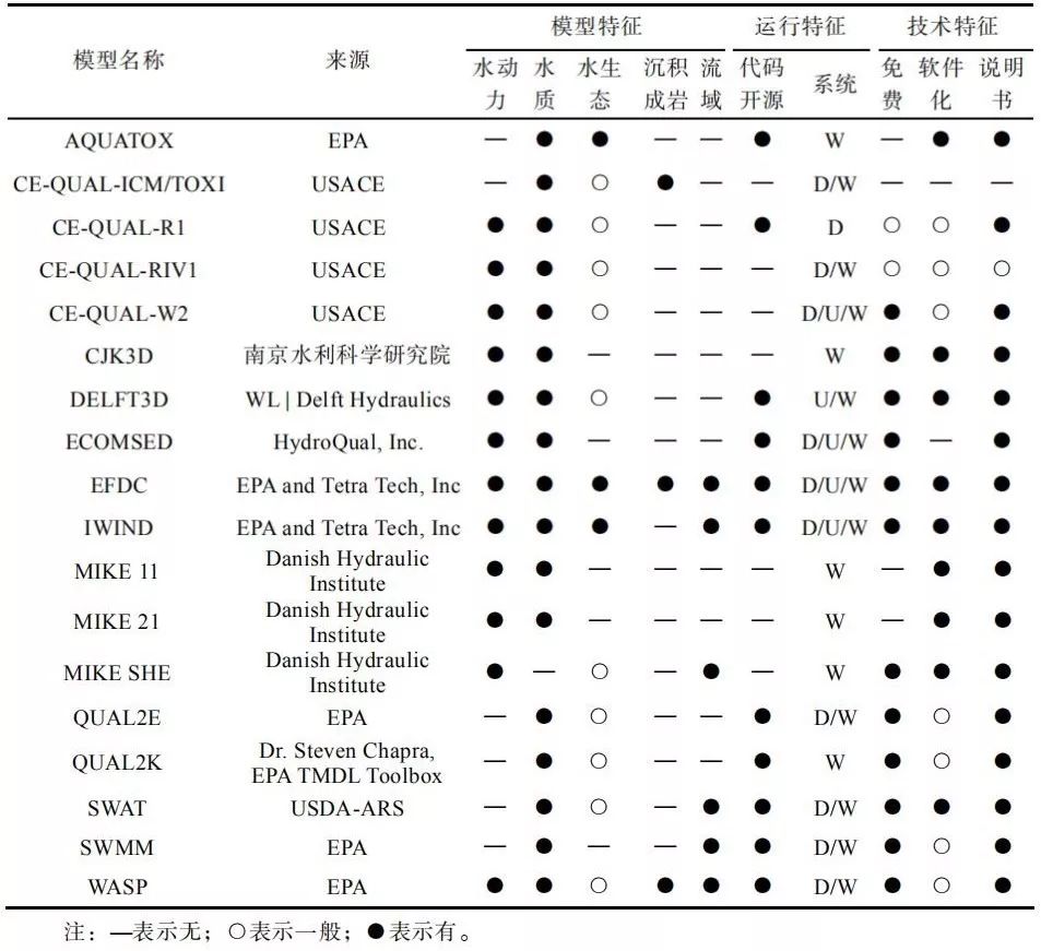 表1列举了国内外常用的18个水环境模型,统计指标包含模型特征、运行特征以及技术特征三大方面。其中,三分之二的模型设置有水动力模块,除了 MIKE SHE 外,其他模型均能进行水质模拟,能进行水生态模拟的常用模型有 AQUATOX、EFDC 和 IWIND,开发了成熟的沉积成岩模块的模型有 WASP、CE-QUAL-ICM/TOXI 和 EFDC。这些模型中,开源和具备友好的用户界面的模型更受用户的喜爱,也更有利于模型的使用和推广。