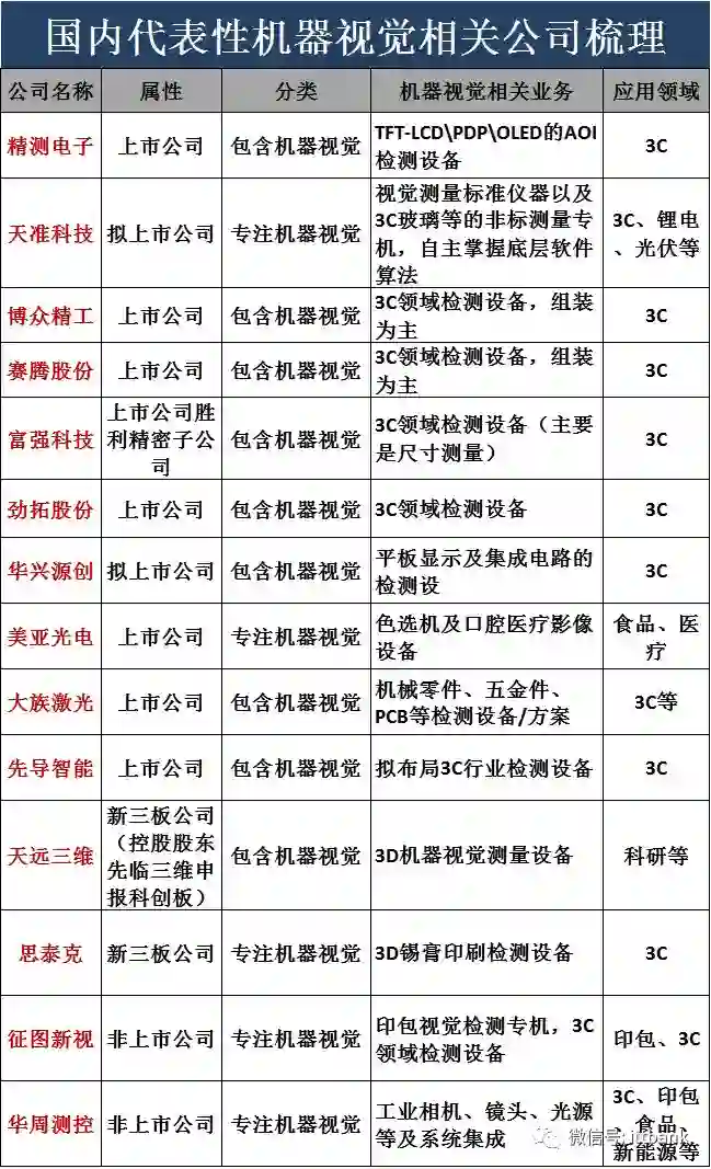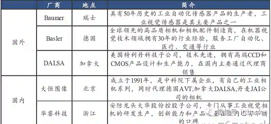 目前来看,国内机器视觉行业的市场参与者主要有四种类型:国际综合自动化公司、国际专业机器视觉公司、国内专业机器视觉公司以及国内自动化设备公司。其中,在底层开发商层面还是国际企业占主导地位,国内公司更多是在附加值更低的二次开发层面布局(形式包括系统集成以及组装生产自动化专机),并在此基础上逐渐向上游核心环节进行尝试。