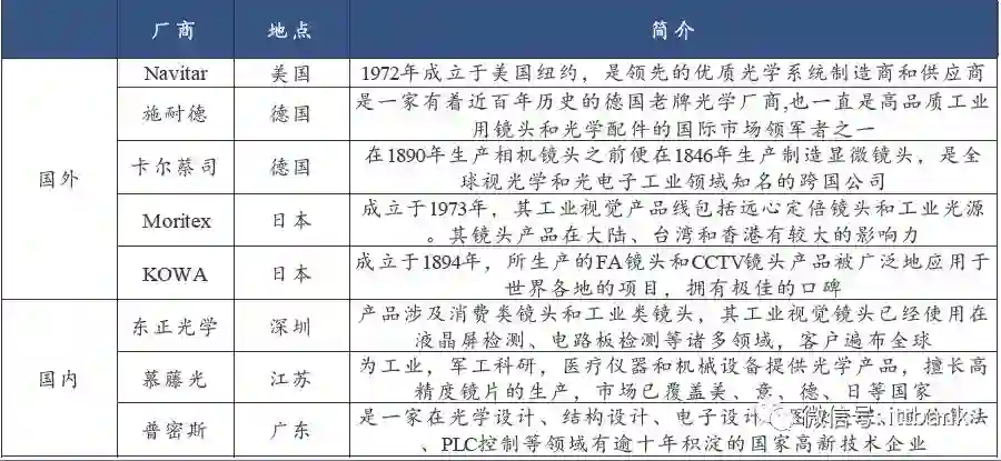 低端镜头国内企业具备一定竞争力,高端镜头基本依赖进口。镜头的基本功能是实现光束调制,将目标成像在图像传感器的光敏面上完成信号传递。工业镜头主要可以分为定焦镜头、定倍镜头、远心镜头、连续变倍镜头等,不同的镜头根据要求应用于不同的工业现场,价格差距也较大。