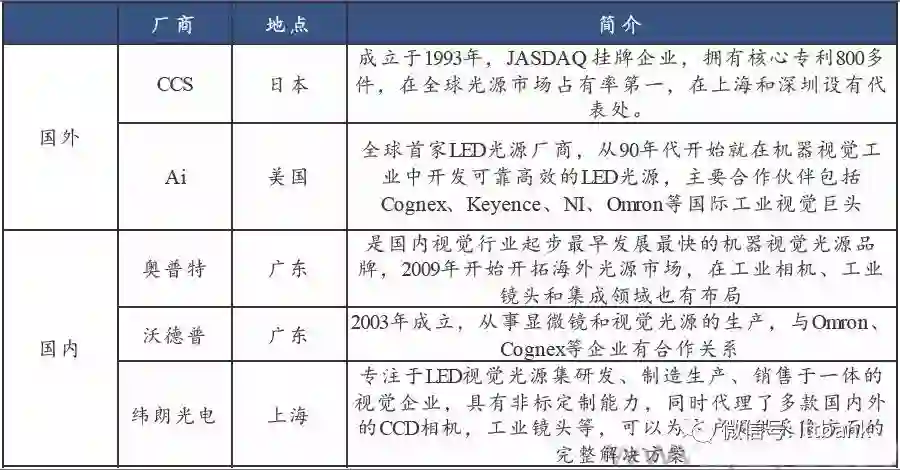 光源是国产化最充分环节。光源的好坏在于对比度、亮度和对位置变化的敏感程度,机器视觉行业主要采用LED 光源产品。目前没有通用的机器视觉照明设备,针对每个特定的应用实例有个性化的方案,以达到最佳效果 。目前光源行业国产化程度高,竞争比较激烈。
