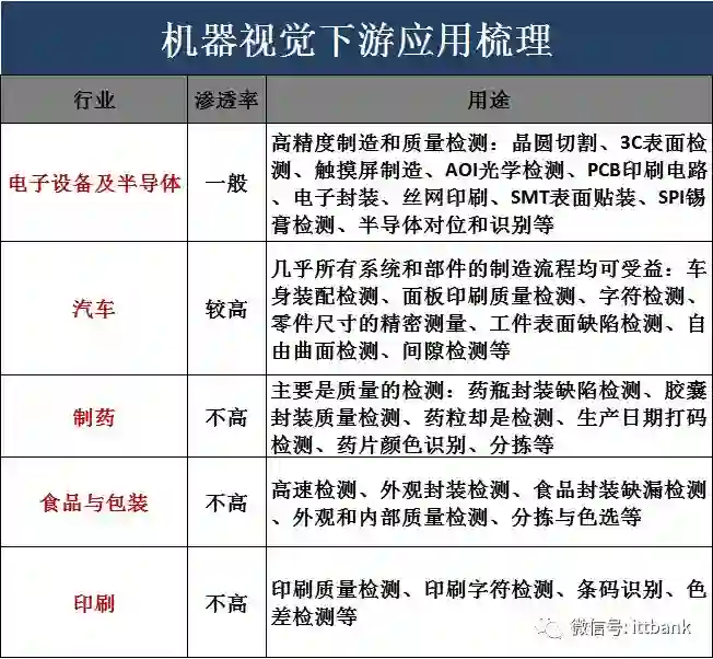 根据前瞻研究院数据,制药行业贡献了机器视觉7%左右的需求,主要应用在药瓶封装缺陷检测、胶囊封装质量检测、药粒却是检测、生产日期打码检测、药片颜色识别及分拣等。目前大多数企业流水线上有1-2套机器视觉系统,而实际需求至少应该在5处,未来随着制药行业自动化升级改造提速,渗透率会持续提升。