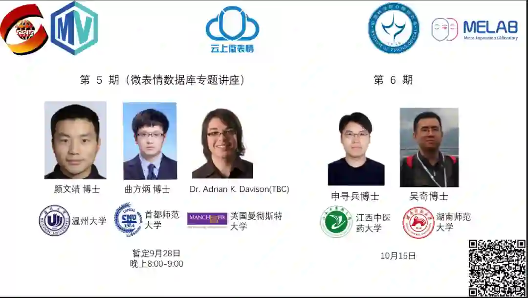 微表情是一种短暂的、微弱的、无意识的面部微表情,持续时间往往在0.5s内,能够揭示人类试图隐藏的真实情绪。微表情识别的研究旨在让机器有足够的智能,能够从人脸视频序列中识别人类的真实情绪。然而由于微表情持续时间短、面部肌肉运动强度低,对其进行准确的表征与识别是一项极具挑战性的任务。为了促进心理学领域和计算机视觉领域针对微表情的进一步研究,由中国图象图形学学会(CSIG)举办、CSIG机器视觉专业委员会承办,中国科学院心理研究所的王甦菁博士组织了一系列云上微表情的学术活动。