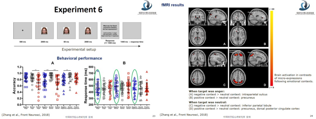 在这个部分,张明博士介绍了行为实验方案和情绪背景效应对微表情识别的影响。行为实验表明,无论目标微表情的持续时间长短,负性情绪背景都会降低对微表情的识别。当控制了情绪背景表情和目标微表情之间的物理刺激差异,对微表情识别的情绪背景效应依然存在,揭示这种影响很可能来源于情绪背景的效价信息。
