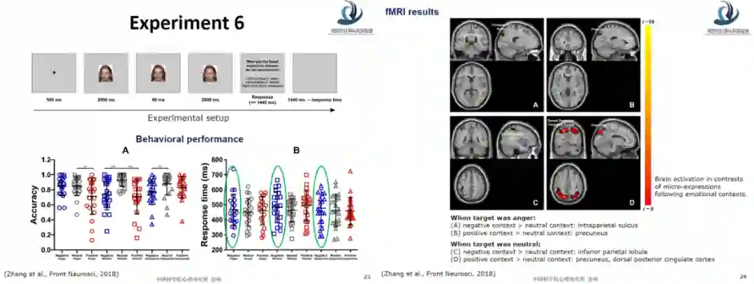 此外,通过功能磁共振研究,张明博士比较了在不同情绪背景(相同微表情)的BOLD信号,发现负性和正性情绪背景的BOLD信号激活增加,反映出情感背景在处理上的差异,暗示着不同的情绪可能会不同程度地影响后续目标微表情的加工,并进一步揭示了情绪背景与微表情之间的相互作用。