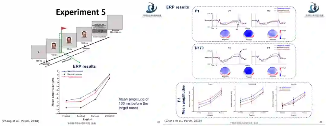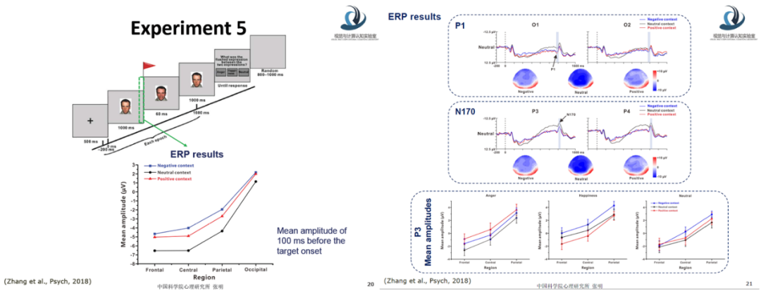 为了进一步考察情绪背景效应的作用方式,张明博士团队采用脑电实验,探讨情绪情境如何调节由微表情引发的ERP成分。他们观察到,与中性情绪背景相比,负性情绪背景和正性情绪背景条件下,微表情产生了大的P1和N170成分,而且当情绪背景和目标微表情效价不一致时,微表情引发了更大的P1成分。这些结果表明情绪背景调节了微表情的加工,并且情绪背景的调节发生在面部表情信息处理的早期阶段。基于行为和脑电研究的证据,他们推测这种情绪背景的调节作用可能取决于对情绪背景信息加工的神经活动。