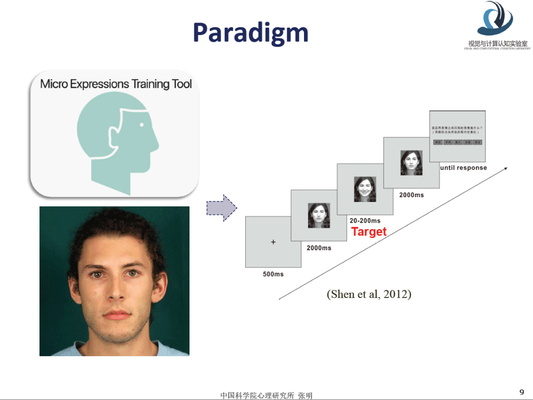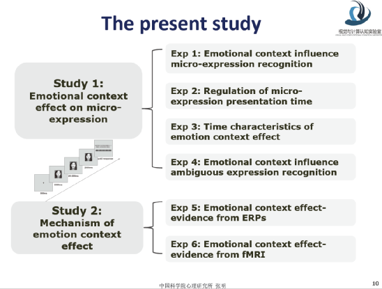 在简要介绍微表情和情绪背景的定义之后,为了探讨微表情前后出现的面部表情类型,即情绪背景,是否会影响微表情的识别,张明博士从行为实验、脑电实验和功能磁共振研究三个方面进行了阐述。