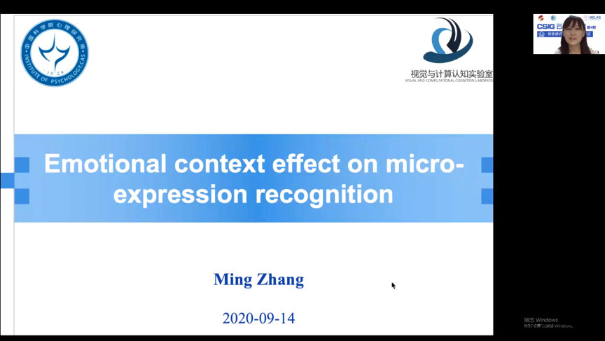 第四期云上微表情于2020年9月14日晚上7点进行,由中国科学院心理研究所王甦菁老师团队的李婧婷博士主持。此次讲座邀请到了中国科学院心理研究所的张明博士,她从心理学的角度介绍了情绪背景对微表情识别的影响。本次报告得到了微表情研究领域的广泛关注,期间有六十多位听众参加了此次讲座。
