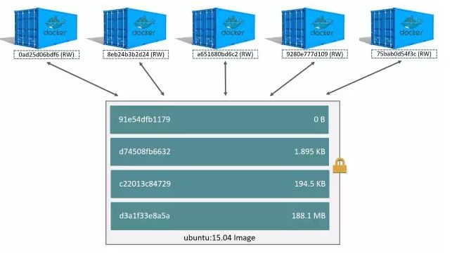 我们知道,一个有众多版本的镜像的所有镜像占据的空间可能比单个版本的镜像占用的空间多不了多少(比如一个nginx镜像有500MB,根据配置的不同我们保存了10个版本,10个版本占用的空间一般和一个nginx镜像占用的空间接近,远低于10个镜像空间的总和)。多个版本占用的空间之所以没有明显增加是由于Docker 容器、镜像可以共享底层的基础文件系统层,虽然镜像的个数很多,但是他们占据的共享镜像层在磁盘中只存在一份,每个容器只需要在自己的最上层加上一个自己独有的可读可写层就可以正常使用了,因为这种存储机制的存在大大提高了Docker 镜像存储的效率。这种模式的主要机制就是分层模型将不同的目录挂载到了同一个虚拟文件系统之上,通过下面这个图可以很好的理解这种模式。