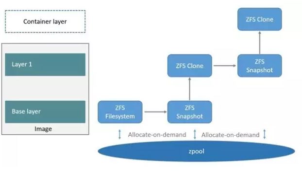 在容器环境中使用ZFS 文件系统时,会先从存储池中为Docker镜像的基础层分配一个ZFS 文件系统,Docker 镜像的其他层来自ZFS文件系统快照的克隆,当容器运行起来的时候会在Docker 镜像的最顶层生成一个可写层。