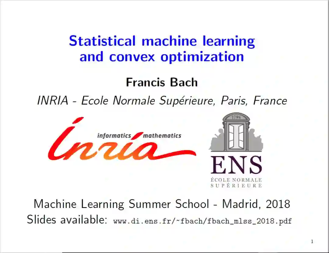 统计机器学习(Statistical Machine Learning)是关于计算机基于数据构建概率统计模型并运用模型对数据进行预测与分析的一门学科。凸优化(convex optimization)是指一种比较特殊的优化,是指求取最小值的目标函数为凸函数的一类优化问题。两者都是现代机器学习研究和实践的重要理论基础。今天给大家带来的是由 INRIA 的 Francis Bach 主讲的 246 页《统计机器学习与凸优化》教程。
