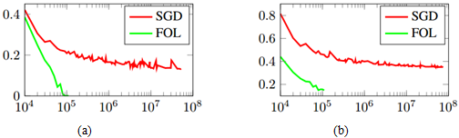 在实验中作者采用CNN模型进行人脸识别,模型分别采用了SGD和FOL这两种优化策略。在训练集上,FOL的收敛速度明显优于SGD。这是因为当分类误差达到一个很小的值(<0.4%)时,识别任务的训练对于SGD而言,每千个训练样本中只有4个训练样本是包含有效信息的。如果每个迭代步选择的batch大小为64,则SGD平均每15轮才能挑选到一个包含有效信息的训练样本。而FOL在每个迭代步平均可以包含32个有效的训练样本。在测试集上,FOL的表现性能也明显优于SGD。
