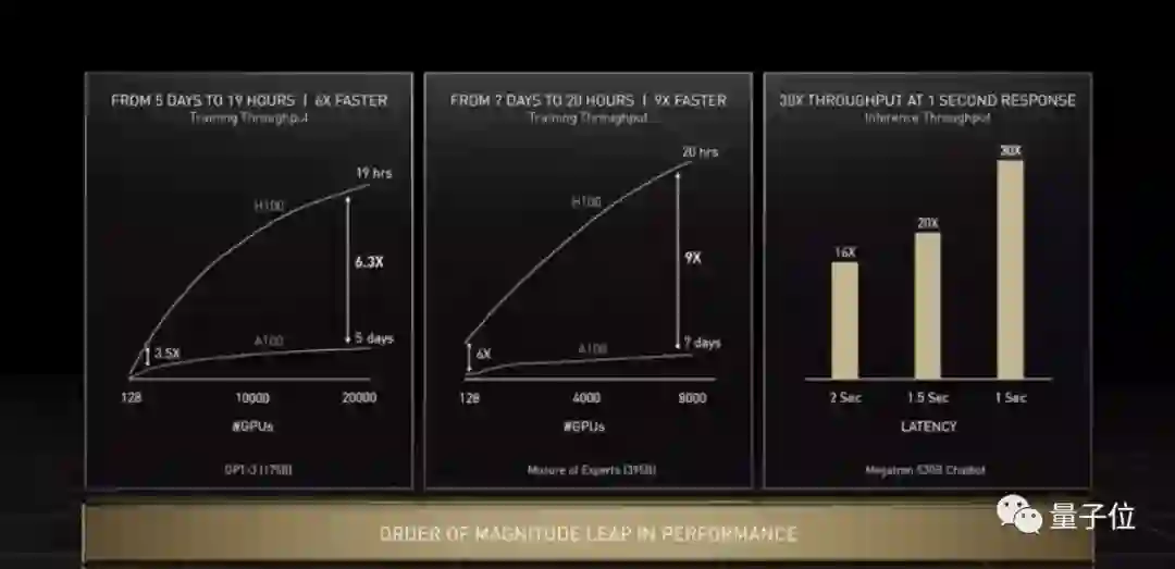 推理性能也是大幅提升,像英伟达推出的5300亿 Megatron模型,在H100上推理时的吞吐量比A100直接高出30倍,响应延迟降低到1秒,可以说是完美hold住了。