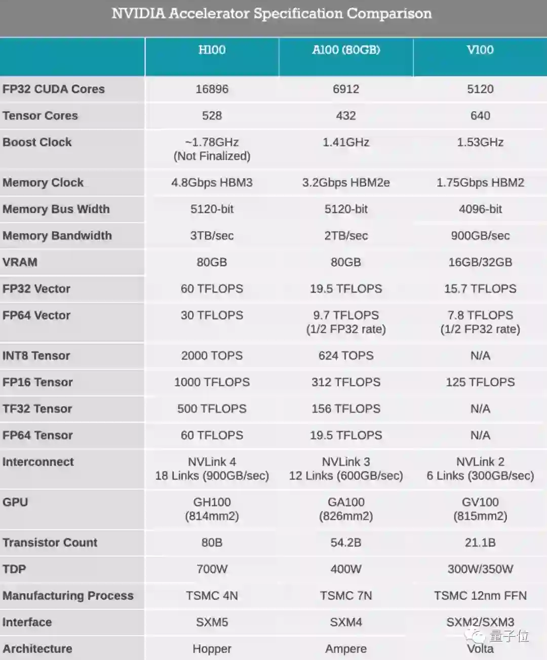 整体参数细节究竟如何,与前代A100和V100对比一下就知道了: