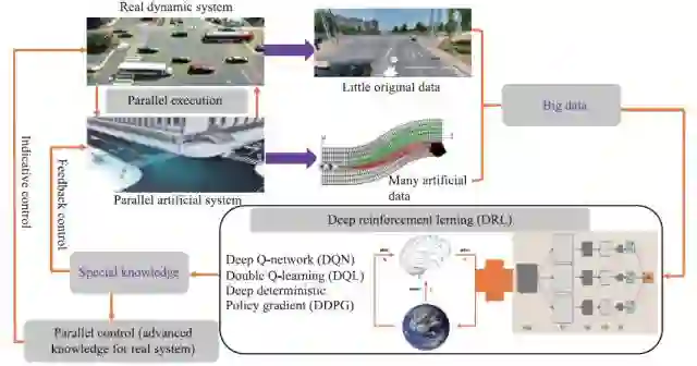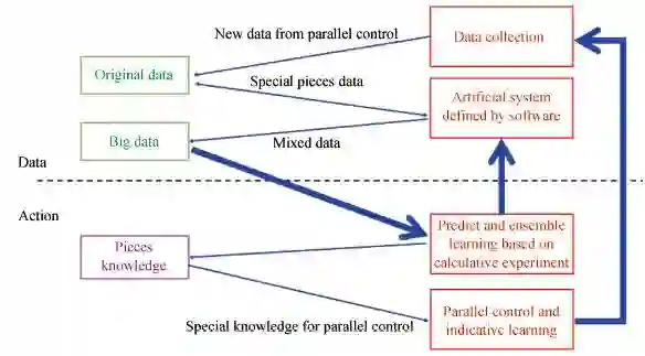 图6 平行增强学习理论框架. 主要包括数据收集及生成过程、数据处理及最优策略的计算过程、特定知识的应用过程