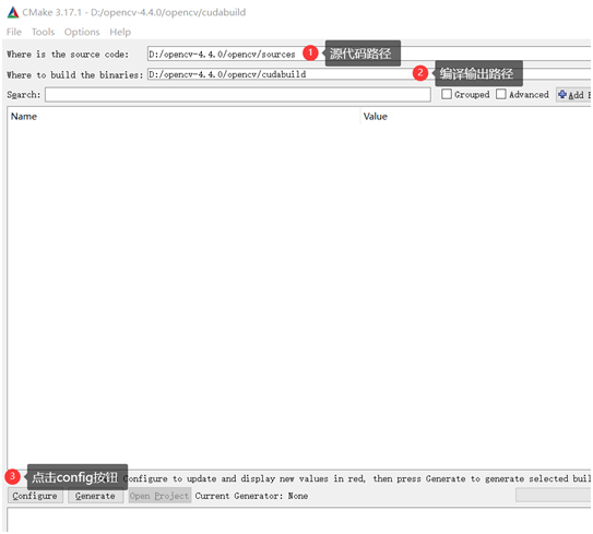 第一步:打开CMake,设置好下面的目录路径,注意源代码路径需要指向真实的OpenCV的source目录。图示如下: