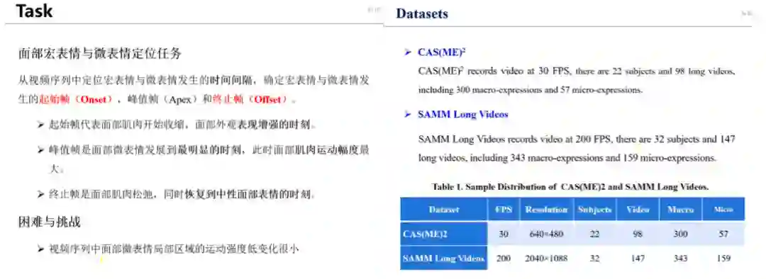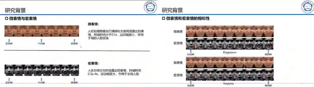 同样,夏斌同学首先介绍了微表情和宏表情的定义和应用场景。由于微表情的样本量比较少并且微表情本身十分微小短暂,基于微表情数据训练的网络框架鲁棒性比较弱。与此同时,宏表情具有较强的运动强度和较长的持续时间,并且和微表情的肌肉运动有相似性。因此,如何利用大量的宏表情数据来辅助微表情识别研究,是他们研究的方向。