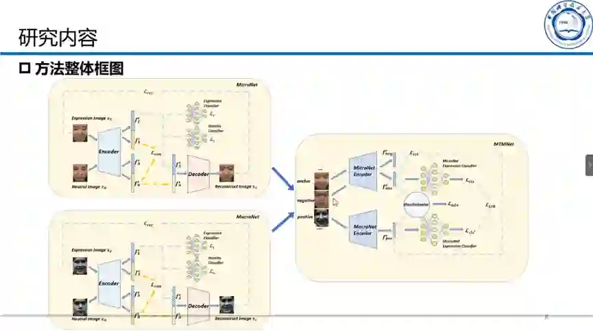 然后夏斌同学介绍了他们的方法框架,如下图所示。首先,为微表情设计了一个表情身份解缠网络(如图左上部分)。将微表情的表情图像和无表情图像输入到解缠网络,分离得到微表情样本的表情信息和身份信息,并将表情信息用于后续的分析。同理,为宏表情样本设计了一个表情身份解缠网络(如图左下部分)。然后,搭建从宏表情到微表情的迁移网络(如图右半部分),利用三元组分类(微表情图片(固定样本),同一组别的宏表情样本(正样本),不同类别的微表情图片(负样本)),通过解缠网络的编码器提取表情信息,在特征空间和标签空间中,将宏表情的信息迁移到微表情,实现微表情识别。