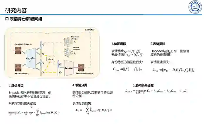 接下来,夏斌同学主要介绍了表情身份解缠网络框架图,通过一些约束,从微表情图中得到表情特征,减少身份信息对微表情信息的干扰。下图展示了解缠网络的关键步骤。