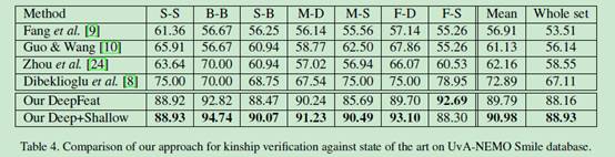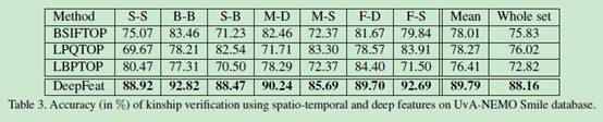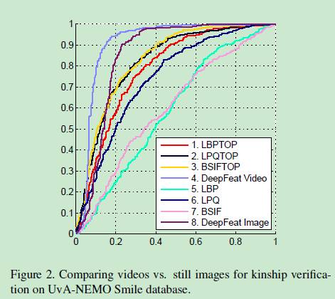 目前多数的亲属识别方法还停留在传统的从静态的图片中提取浅层手动设计的特征,这篇文章的贡献点有以下两个方面:1.将问题从时空角度出发进行考虑 2.将浅层的时空纹理特征与一些深度特征相融合。实验证明以上两个方面在UvA-NEMOSmile database上都可以有效提高亲属识别的准确率。