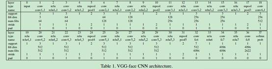 2.深度特征:CNN,由于亲属识别数据集比较小,神经网络模型需要大量的训练数据,所以我们采用预训练的方法通过VGG-face network提取深度特征, VGG-facenetwork是用大量的人脸识别的图像训练出来的一个模型,接收224*224像素的图像输入,通过13个卷积层+relu,mpool,fc层产生一个4096维的向量以便我们可以有效利用。网络结构如下,实验中将视频一帧一帧的送入网络提取深度特征,最后对所有帧的图像特征求平均得到最终的人脸深度特征属性。
