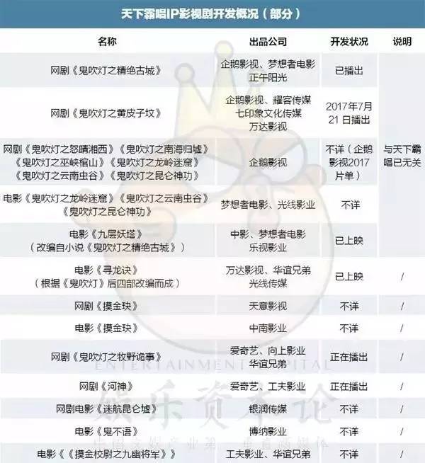 天下霸唱转授的版权则是单兵作战,分散布局,难以形成联动。其实霸唱的作品改编数量明显多于三叔,但作为重头戏的《鬼吹灯》系列,据王笑东透露,前八本作品等于作废了,因为版权早已转落他人手。换句话说,就是在未来的各种开发中,好坏都不会给天下霸唱带来可视化的曝光度。