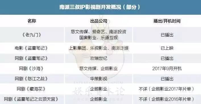 南派泛娱创建的首要目的在于南派三叔需将自己的作品版权掌控在手,并对其进行影视剧、舞台剧、游戏、漫画等一系列改编运作,扩充价值收益。除了《盗墓笔记》之外,南派泛娱旗下还有《沙海》《藏海花》《老九门》三个盗墓IP,以及《怒江之战》、《大漠苍狼》等(点击蓝字回顾),虽然这些作品的衍生开发难以达到《盗墓笔记》的高度,但其价值已不容小觑。