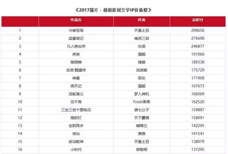 作为盗墓题材的先入者,在很长时间内,天下霸唱的小说《鬼吹灯》都领先于南派三叔的《盗墓笔记》。但《盗墓笔记》的IP价值已经后来居上。根据《2017猫片·胡润原创文学IP价值榜》,《盗墓笔记》位列第2,而《鬼吹灯》并未进入前10。在2017作家富豪榜上,三叔的版税排名也更为靠前。