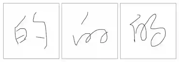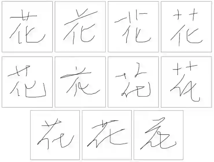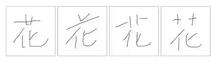 苹果的研究人员们发现了非常多样的书写方式。如下图2到图4是其中一些U+82B1(花)的写法,有的接近打印,有的很潦草,有的变化很大。