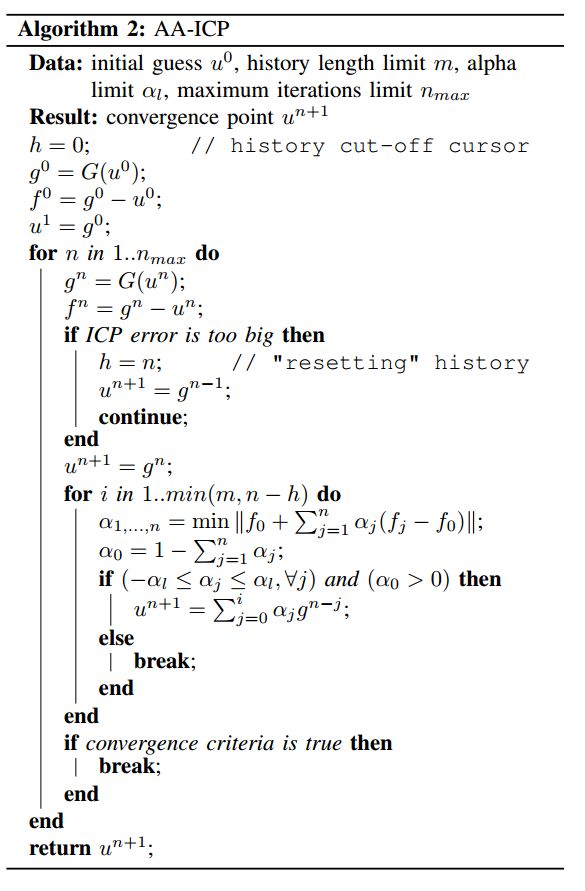 图3:AA-ICP算法流程。为了弥补Anderson加速法在非压缩映射时的不稳定性,作者提出两个启发式的约束: