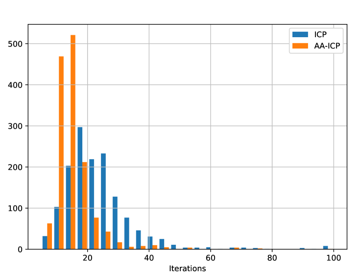 图5:ICP与AA-ICP收敛迭代次数直方图统计。从图中可以看到AA-ICP大部分在10次~30次以内可以收敛。