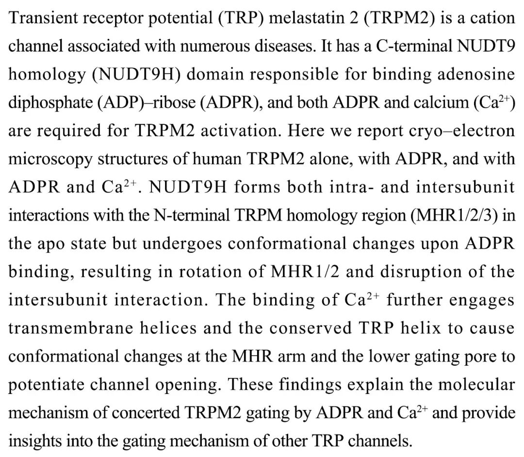 (导读 郑维嘉)瞬时受体电位Melastatin蛋白(TRPM2)是一类与多种疾病相关的阳离子通道,其含有C端NUDT9-H结构域,负责结合ADPR,ADPR和Ca2+激活TRPM2。本研究报告仅人TRPM2,结合ADPR的TRPM2,及结合ADPR和Ca2+的TRPM2三种低温电子显微镜结构。发现NUDT9H与ADPR结合时发生构象变化导致MHR1/2的旋转和亚基内部反应的中断。而与Ca2+结合使跨膜螺旋和守恒的TRP螺旋结合,引起MHR臂及低位门控的构象变化,进而加强通道开放。此发现可为其他TRP通道门控机制的研究提供参考。