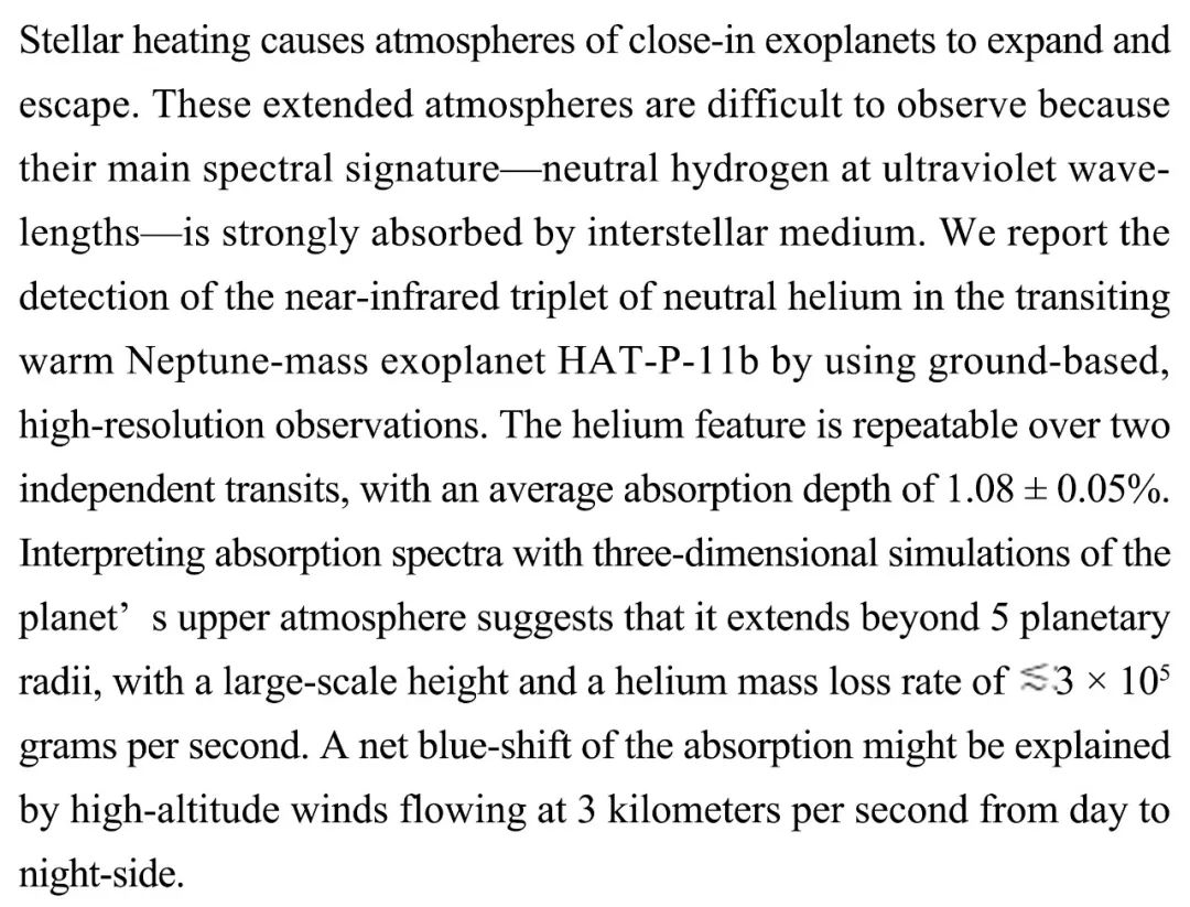 (导读 王嘉媛)行星表面的延伸大气难以观察,原因在于此类大气的主要光谱特征,即紫外波段的中性氢易被星际介质吸收。 本研究报告了在质量相当于海王星的系外行星中检测到中性氦的近红外三重态, 而行星高空大气层的三维模拟表明其吸收光谱具有大范围高度和较低的质量损失。