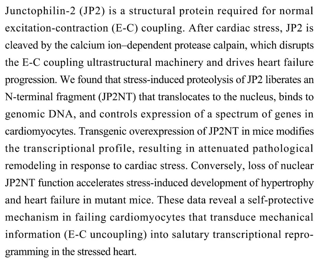 (导读 郭怿暄)亲联蛋白-2(JP2)是心肌细胞正常兴奋-收缩(E-C)偶联必需的结构蛋白。本研究发现应激诱导JP2蛋白水解,释放出N末端片段(JP2NT)转位到细胞核,与基因组DNA结合,调控心肌细胞基因表达。小鼠过量表达JP2NT可改变转录谱,减弱心脏应激引起的病理重塑。反之失去核JP2NT加重小鼠心肌肥大和心衰。该结果揭示了心肌将机械信息转化为转录重编程的自我保护机制。