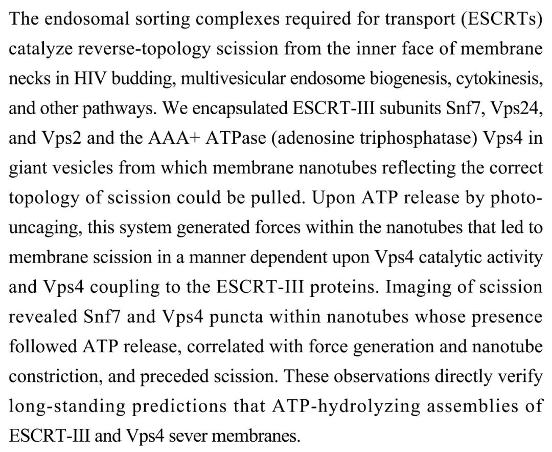 (导读 柳寒石)转运所需的内吞体分选复合物(ESCRT)催化HIV出芽等途径中膜颈内表面的逆向拓扑断裂。 研究发现包裹ESCRT-III亚基的大囊泡通过光解释放ATP时,在纳米管内产生导致膜断裂的力,其方式取决于Vps4催化活性和Vps4与ESCRT-III蛋白的偶联。 断裂成像揭示了纳米管内Snf7和Vps4点状突起与ATP释放以及力的产生和纳米管收缩的关系。 这些观察直接验证了长期以来的推测。