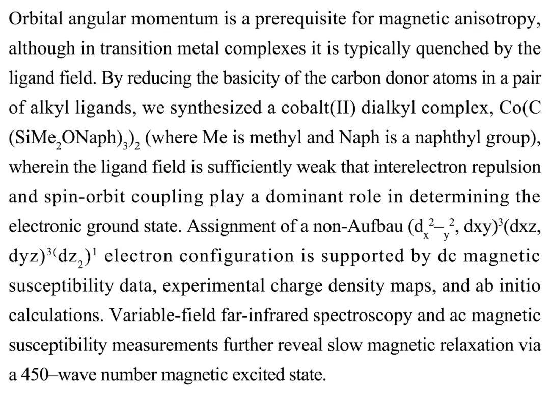 (导读 阿金)轨道角动量是磁各向异性产生的先决条件。本研究通过减少一对烷基配体中碳施主原子的碱性,合成了钴(II)二烷基复合物Co(C(SiMe2ONaph)3)2。直流磁化率、电荷密度图谱和第一性原理计算支持非构造电子配置的分配。而变磁场远红外能谱和交流磁化率测量进一步揭示了缓慢的磁弛豫现象。