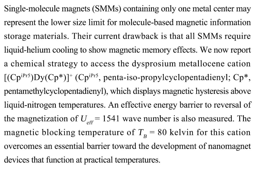 (导读 阿金)单分子磁体(SMMs)代表了基于分子的磁性信息储存材料的尺寸下限,但缺点是所有SMMs需要液氦冷却来实现磁记忆效应。本研究报告一种获得镝金属茂络合物阳离子的方法。这种阳离子显示出磁阻的温度为80开尔文,从而有效降低了研发纳米磁性器件的温度要求。