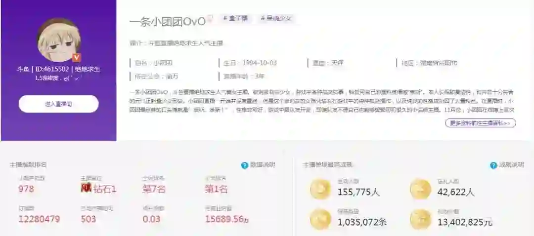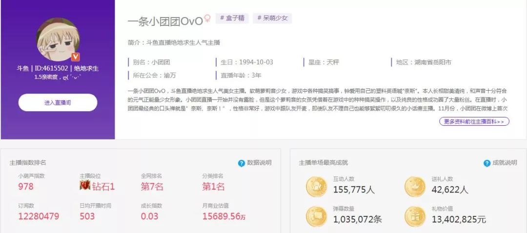 就与斗鱼新晋吃鸡女主播小团团相比,冯提莫在斗鱼已经掉出第一梯队。同样作为斗鱼的头部主播,冯提莫是以表演为主的秀场类主播,和依靠游戏技能生存的游戏类主播还是有区别的。冯提莫在斗鱼的ARPPU,也就是每付费用户平均收益并不高。