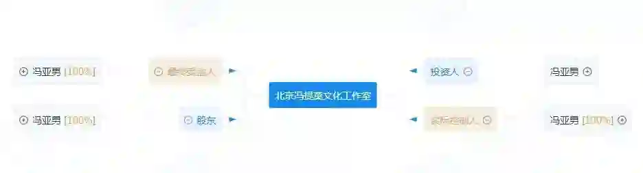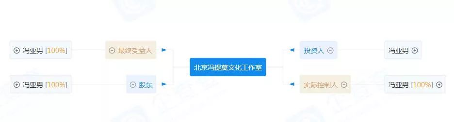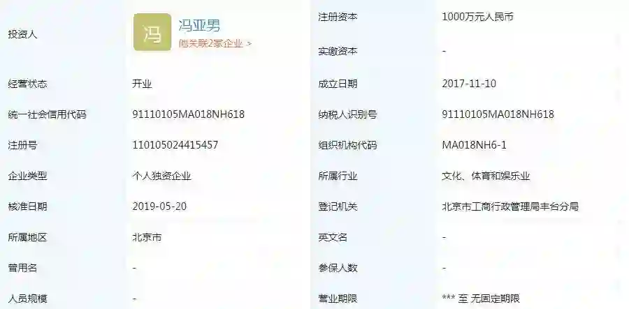 除了签约平台之外,盒饭财经(ID:daxiongfan)在企查查获知,冯提莫(冯亚男)于2017年11月注册了北京冯提莫文化工作室,并100%控股。