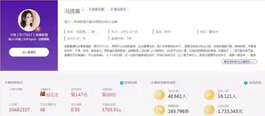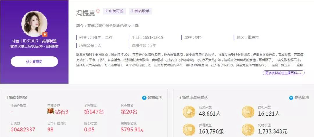 这对斗鱼来说很难受,“食之无味,弃之可惜”。斗鱼应该想清楚需不需要花大价钱签约冯提莫,虽然不能带来实质收入,但可以通过冯提莫提高斗鱼的影响力。