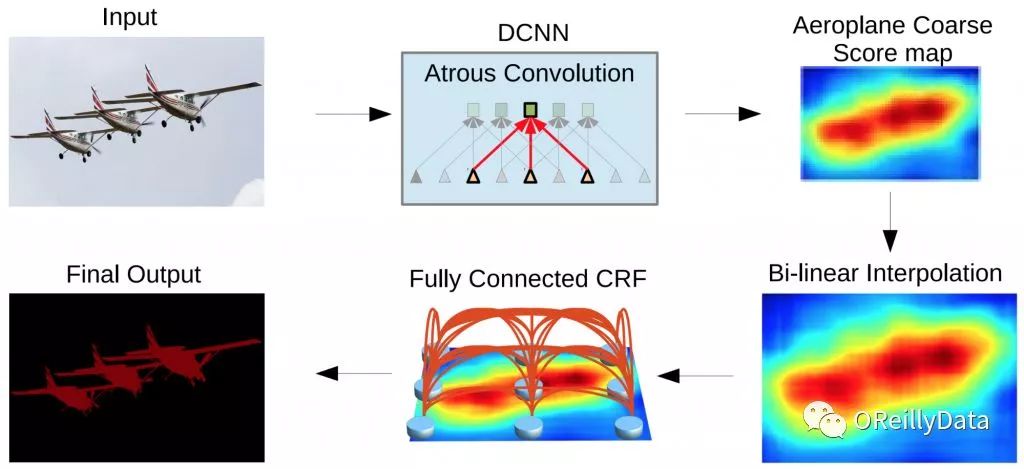 图2 DeepLab2的图像分割管道,来自Liang-Chieh Chen等。注意这里面CNN的输出(右上角图)是非常得粗糙。这就需要一些额外的步骤来恢复丢失的细节。图片来自论文《DeepLab: Semantic Image Segmentation with Deep Convolutional Nets, Atrous Convolution, and Fully Connected CRFs》,获作者友情授权使用。可以查看S. Chilamkurthy的这篇很棒的博文来了解语义分割的神经网络的架构有多么复杂多样。