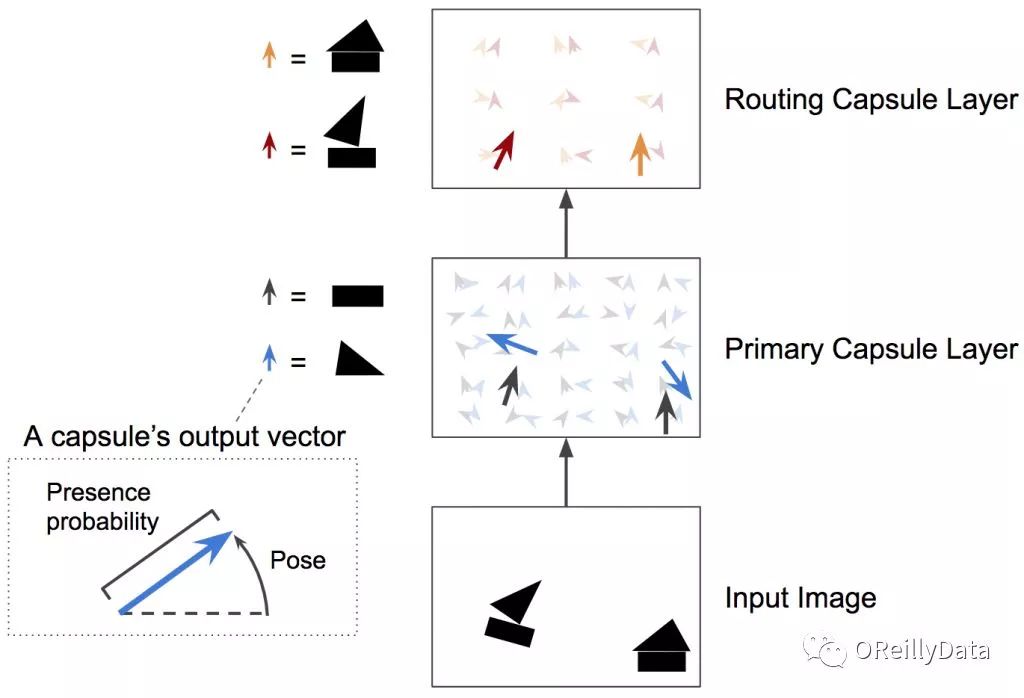 图4 一个两层的CapsNet。在本例里,向量胶囊层有两个5x5胶囊的特征图。其中第二个胶囊层有两组3x3胶囊的特征图。每个胶囊输出一个向量。每个箭头代表不同的胶囊的输出。蓝色的箭头代表那些检测三角形的胶囊的输出;黑色箭头代表试图检测矩形的胶囊的输出。图片由Aurélien Géron提供。
