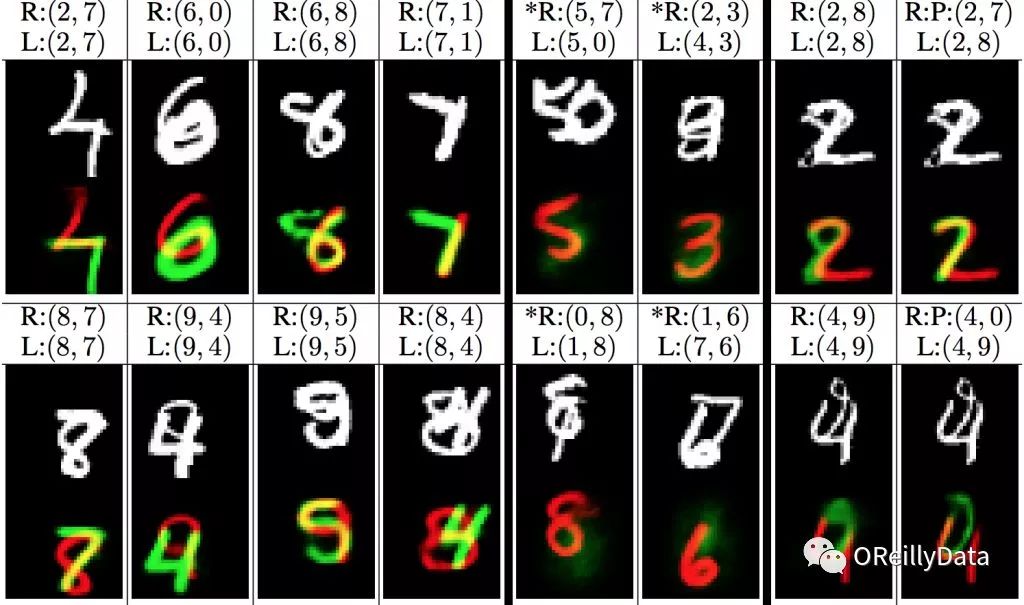 图3 MultiMNIST图片(白色)和由CapsNet重构后的结果(红色和绿色)。“R”=重构后的结果;“L”=标注。例如,对第一个样例(左上角)的预测是准确的,重构的结果也对。但是在第五个例子里,预测(5,7)是错的,不是(5,0)。因此,5被正确地重构了,但是0没有。图片来自论文《Dynamic routing between capsules》,作者友情授权使用。