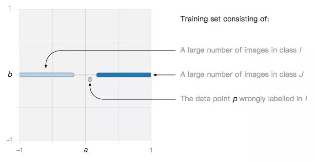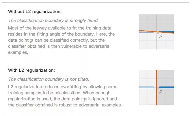 分类边界不倾斜(L2正则化)。L2正则化防止过拟合的思路是允许一小部分数据被分类错误,如噪声数据p。忽略它后,分类器在面对对抗样本时更稳健了。