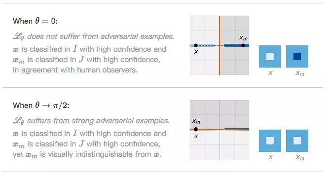 当θ=0时,Lθ没有受到对抗样本影响。x被分类为I的置信度很高,xm被分类为J的置信度也很高,我们可以轻松区分两者。
