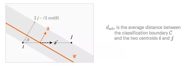 综合以上推算,在给定训练集T上,如果两个质心‖j−i‖之间的距离是个固定值,那对抗距离dadv仅取决于倾斜角θ。通俗地讲:
