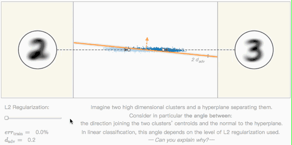 之前我们得出了两个结论:(1)分类边界越靠近数据流形,越容易出现对抗样本;(2)L2正则化可以控制边界的倾斜角度。虽然都是基于二维图像空间提出的,但对于一般情况,它们实际上都是成立的。
